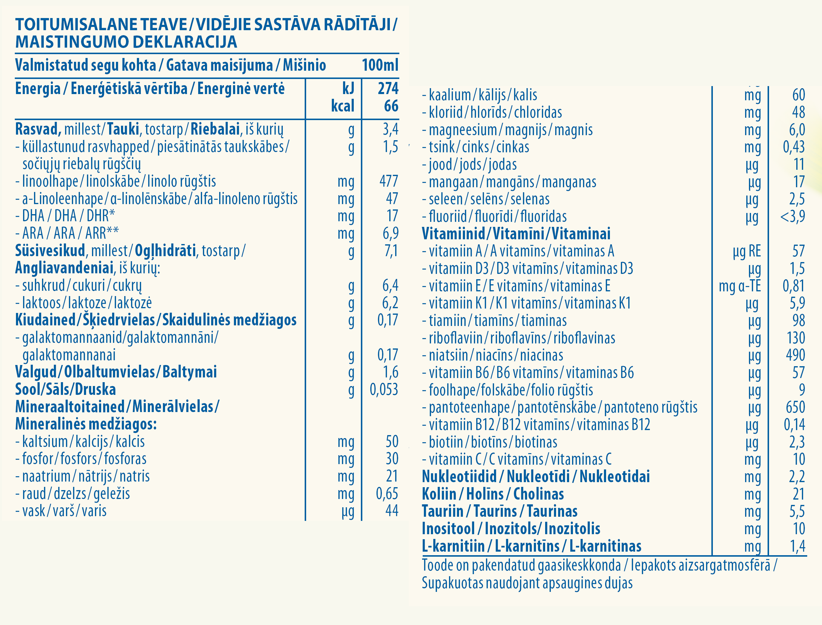 SASTĀVDAĻAS: laktoze, augu eļļas (palmu, palmu kodolu, rapšu (ar zemu erukskābes līmeni), saulespuķu), sūkalu olbaltumvielu hidrolizāts (no piena), maltodekstrīns, galaktooligosaharīdi (no piena), emulgators (taukskābju mono un diglicerīdu citronskābes esteri), ortofosforskābes kalcija sāļi, zivju eļļa, magnija hlorīds, holīna hlorīds, Mortierella alpina eļļa, nātrija L-askorbāts, inozitols, kālija hlorīds, L-fenilalanīns, L-tirozīns, taurīns, nātrija hlorīds, nukleotīdi (uridīna-5′-monofosfāts (UMF), citidīna-5′-monofosfāts (CMF), inozīna-5′-monofosfāts (IMF), adenozīna-5′-monofosfāts (AMF), guanozīna-5′-monofosfāts (GMF)), dzelzs sulfāts, emulgators (saulespuķu lecitīns), L-karnitīna tartrāts, cinka sulfāts, L-askorbil-6-palmitāts, kalcija D-pantotenāts, antioksidanti (tokoferola ekstrakts), DL-α-tokoferilacetāts, nikotīnamīds, vara sulfāts, tiamīna hidrohlorīds, riboflavīns, piridoksīna hidrohlorīds, retinilacetāts, mangāna sulfāts, kālija jodīds, folijskābe, fitomenadions, nātrija selenīts, D-biotīns, holekalciferols, ciānkobalamīns.