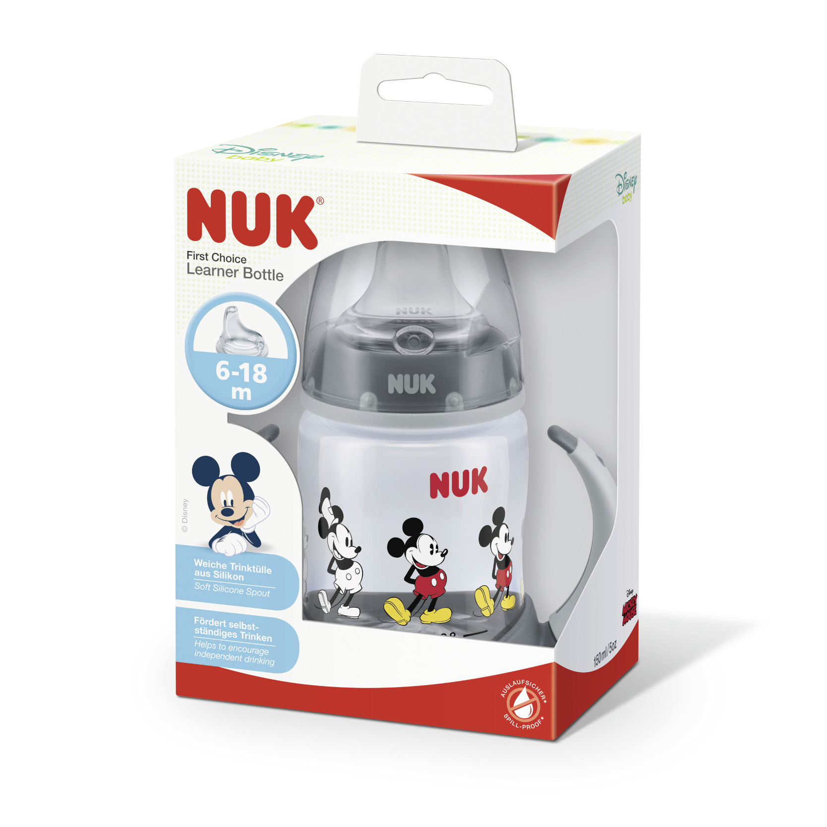 Jauks papildinājums ir visu iemīļotā un atpazīstamā Mikija Mausa motīvi. NUK First Choice mācību pudelīti var savienot ar citām NUK First Choice daļām.