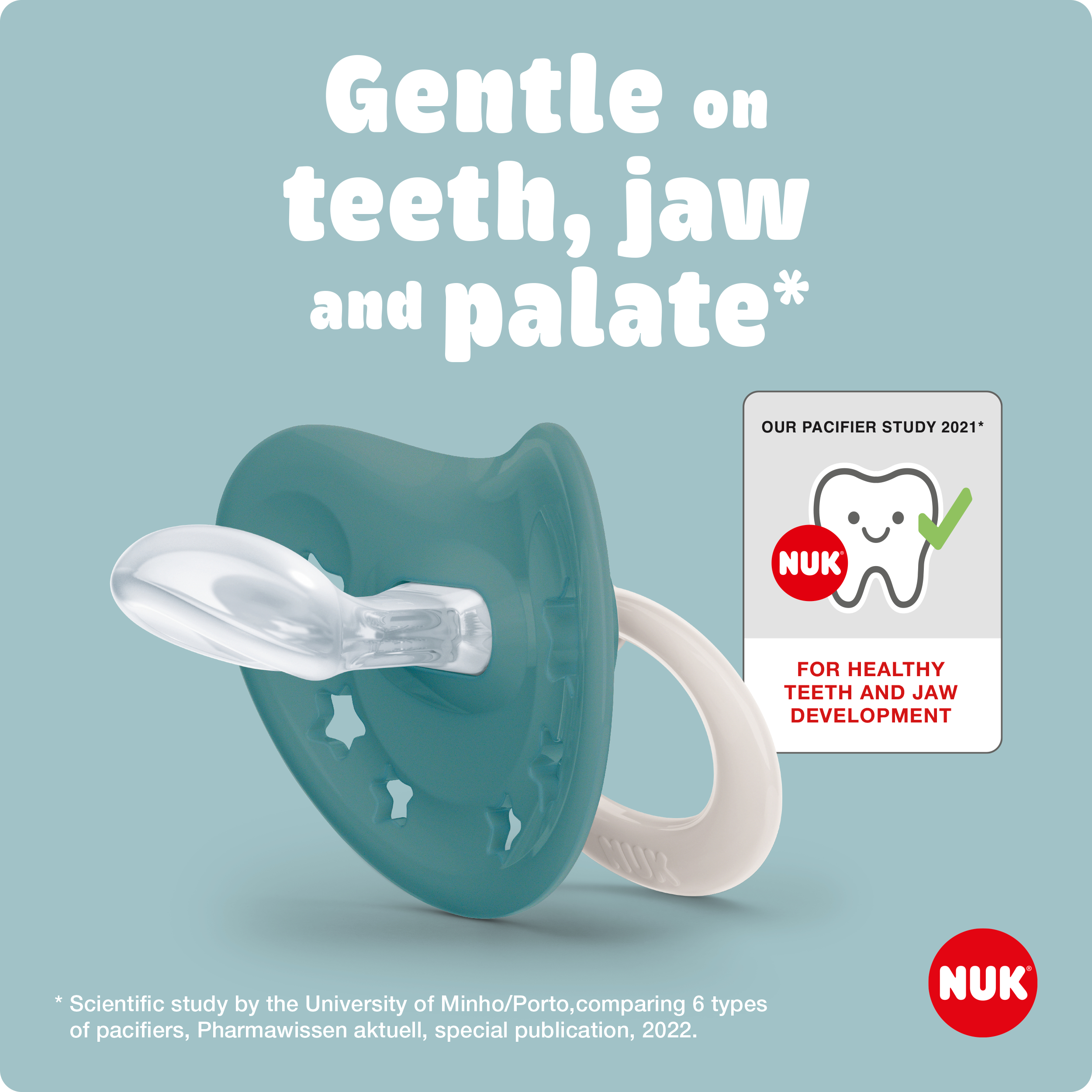 • Oriģinālā NUK forma, kas anatomiski piemējoas žoklim, atstāj pietiekami daudz vietas dabiskām zīšanas kustībām